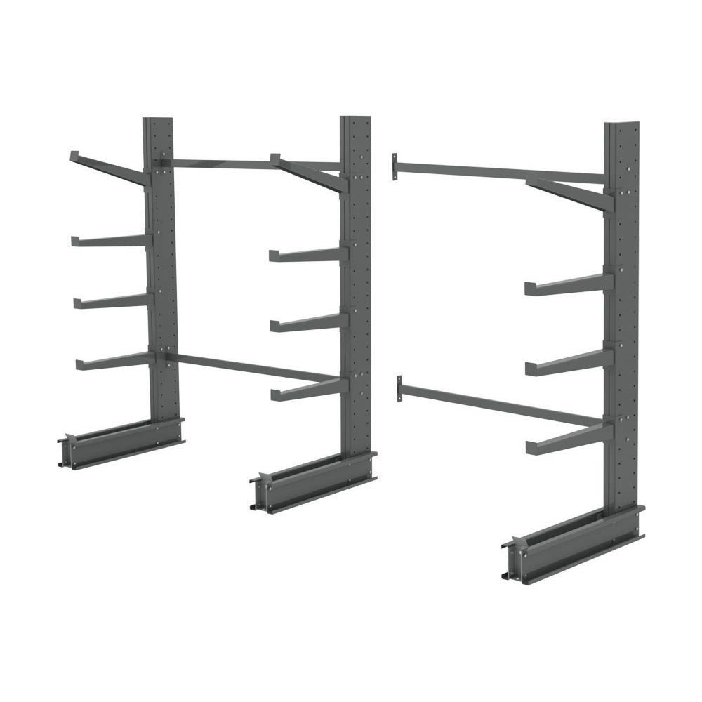 Cantilever storage racks provide the perfect storage solution for bar stock, piping, and lumber. Upright assemblies are constructed of heavy gauge steel and each upright is rated for 6000 lbs. The 24″ deep 7 gauge steel arms are each rated to handle 600 lbs. Racks are sold as starter and add-on units (see ordering explanation below).