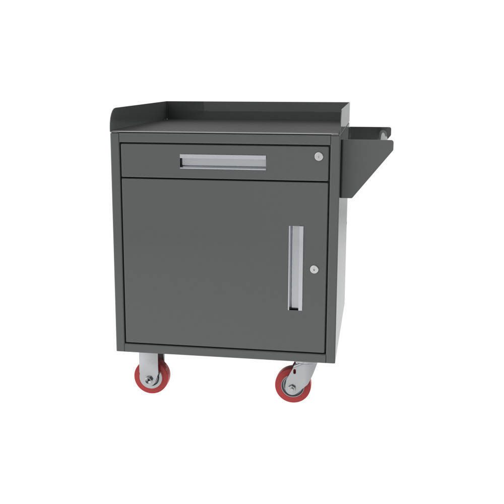 All welded construction and heavy gauge steel, our MG series mobile workbenches are built to last. Overall size – 30”w x 24”d x 38”h – One drawer measures 21.75”w x 20.125”d x 2.50”h – 125 lb Full extension drawer glides – Single door lower storage area measures 21.50”w x 23”d x 18.00”h – (1) Adjustable shelf – Recessed aluminum handles – Individual cylinder locks keyed alike – 4” locking casters