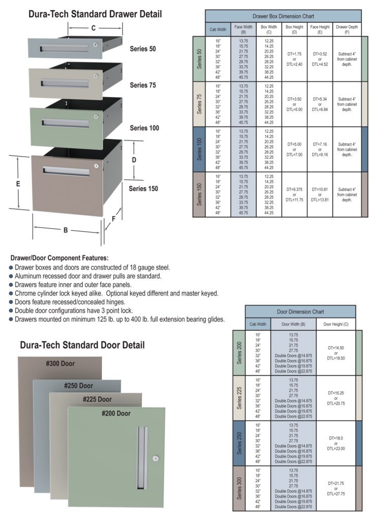 Our Dura-Tech modular cabinets are among the heaviest constructed metal casework cabinets available on the market, featuring all welded case and frame construction. Utilizing this method of construction, each cabinet’s outer shell is made from 16 gauge furniture grade steel. The bases are equipped standard with a 4”h recessed riser base including floor leveler glides. Drawers feature full extension glides rated for a minimum 125 lb capacity and up to 400 lb capacities on specified models. The full inner and outer header drawer and door facings are securely welded together, and all drawer components are manufactured from 18 gauge furniture grade steel with easy access recessed aluminum handles. Individual cylinder locks are keyed alike (standard). All door bases feature an interior adjustable shelf and self-closing concealed door hinges.
