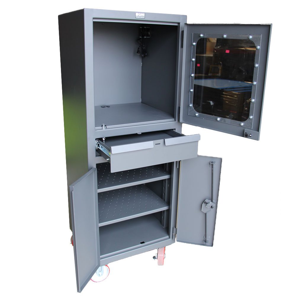 3 Point padlocking system on lower cabinet w/ (2) adj. shelves.