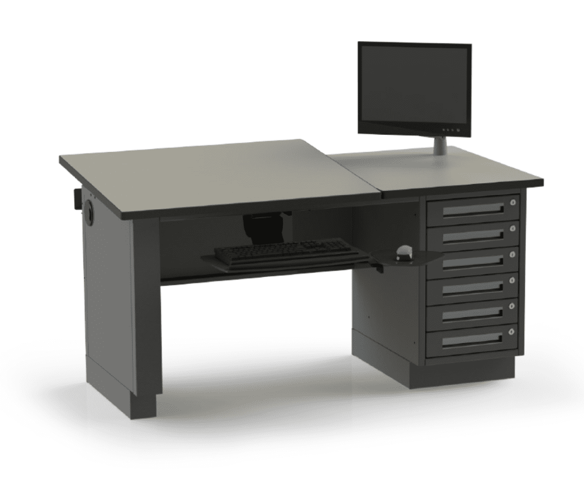 Dura-Tech drafting stations are constructed from 16 and 18 gauge all welded base components with a 1″ thick laminate drafting area and 1″ laminate reference area. All tops are edged in 3MM PVC edging. These stations feature a rear modesty panel and an integrated wire tray for easy wire management. Units are available with a 10-position adjustable tilt work area and a 30″W fixed flat reference area. Stations come standard in a 28″ height. Height dimension listed is to bottom of work surface, for overall working height add 1″ for thickness of top. Storage cabinets are available in three configurations (contact us for other options).