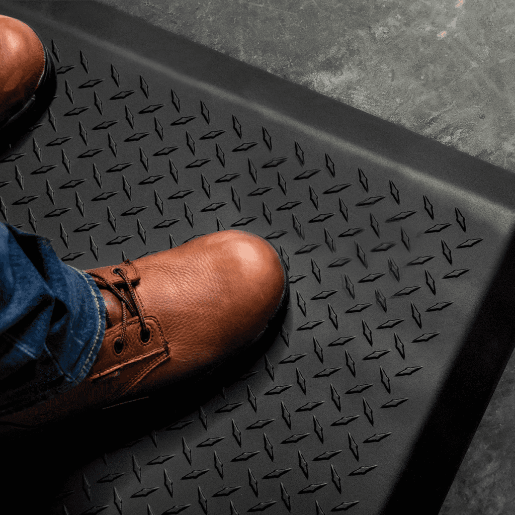 Heavy-duty, anti-fatigue floor mat offering remarkable comfort and safety by helping to reduce back, neck, leg and foot fatigue associated with long-term standing. 100% Made in America, constructed on 3/4″ Pure Polyurethane and include a diamond plate design for added traction. This special surface tread provides additional safety and secure footing.