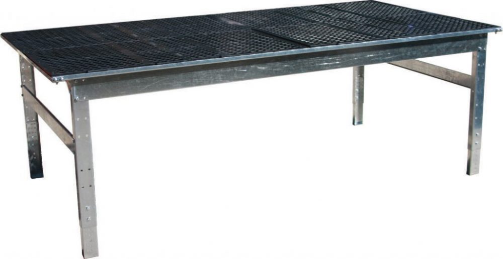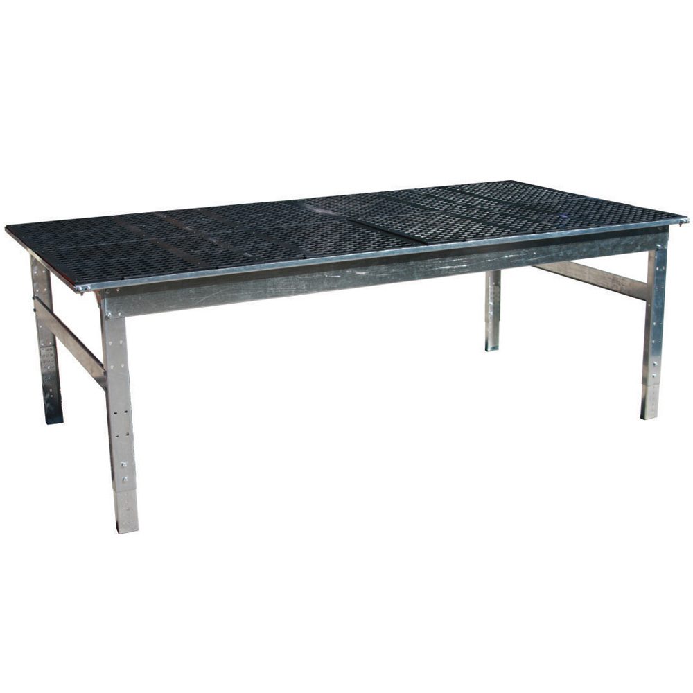 Growing tables feature a 13 gauge galvanized steel base frame with work surface supports. Sturdy formed channel adjustable height legs with floor anchor pads.