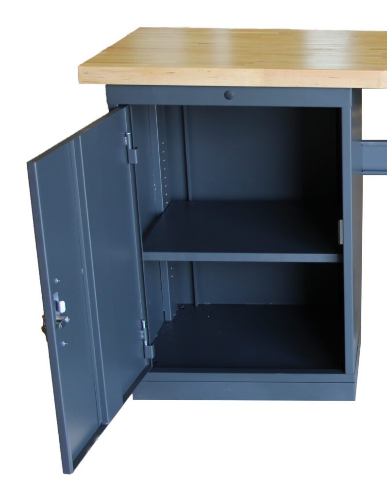 Cabinets feature drawers that fully extend on 250 lb. ball bearing drawer glides that ensure you get maximum usability from every drawer. The contents of your drawers and cabinets remain secure with a keyed cylinder style lock. Drawers are configured in a variety of heights that range from our smallest 3”H drawer face height up to 12”H for storage of larger components. Drawer faces are inset within the workstation for a clean and professional look.