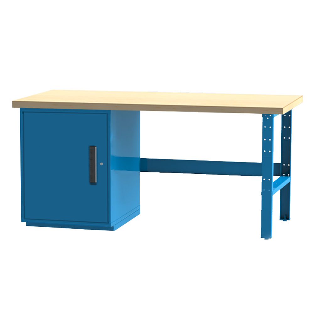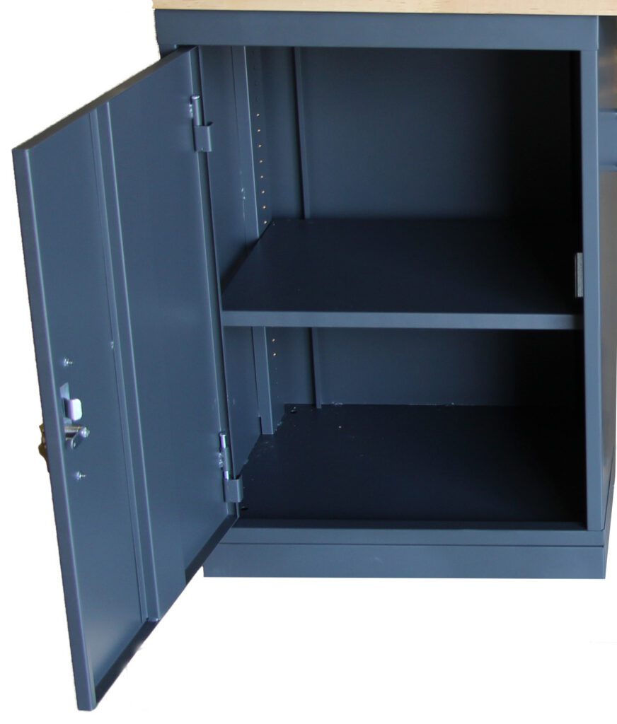 Cabinets feature a single door with adjustable height shelf inside. The contents of your cabinets remain secure with a keyed cylinder style lock. Doors are mounted on heavy duty hinges and feature an aluminum pull handle. Door faces are inset within the workstation for a clean and professional look.