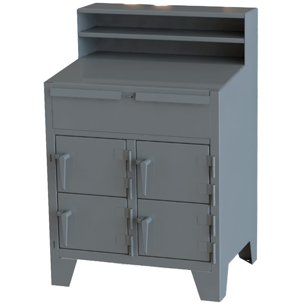 Features all welded 12ga steel construction. Desk features 4 individual lockers that make it ideal for multi-shift operations that share the same workstation.